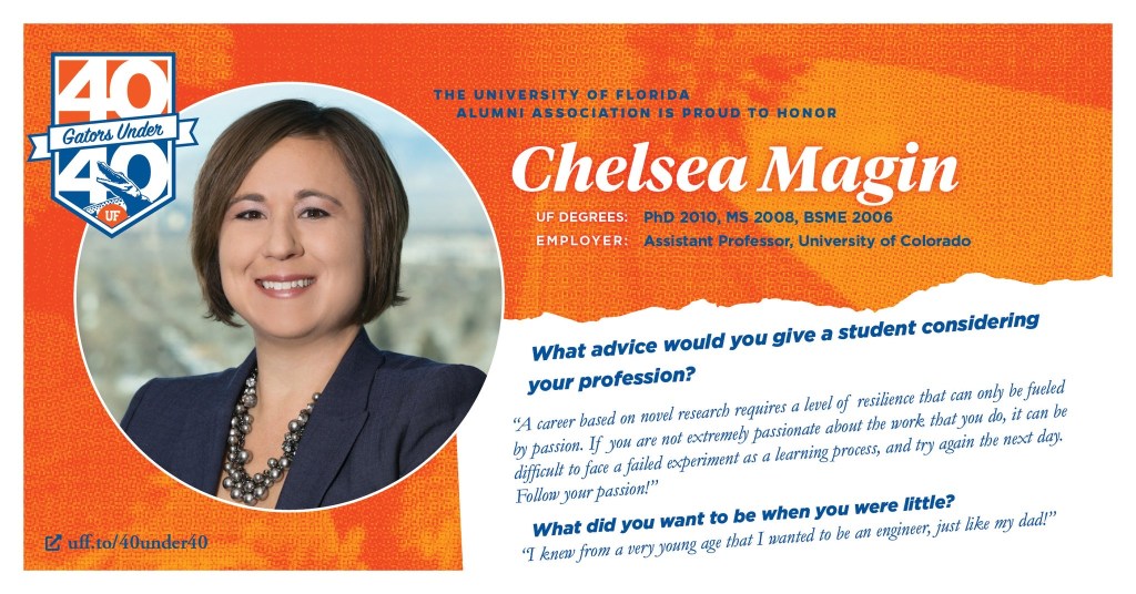 Chelsea Magin, assistant professor of bioengineering, was named a 2021 “40 Gators Under 40” from her alma mater University of Florida. The winners were announced via social media, and Magin was recognized on the 40 Gators Under 40 website. She will be honored at an in-person celebration this fall.