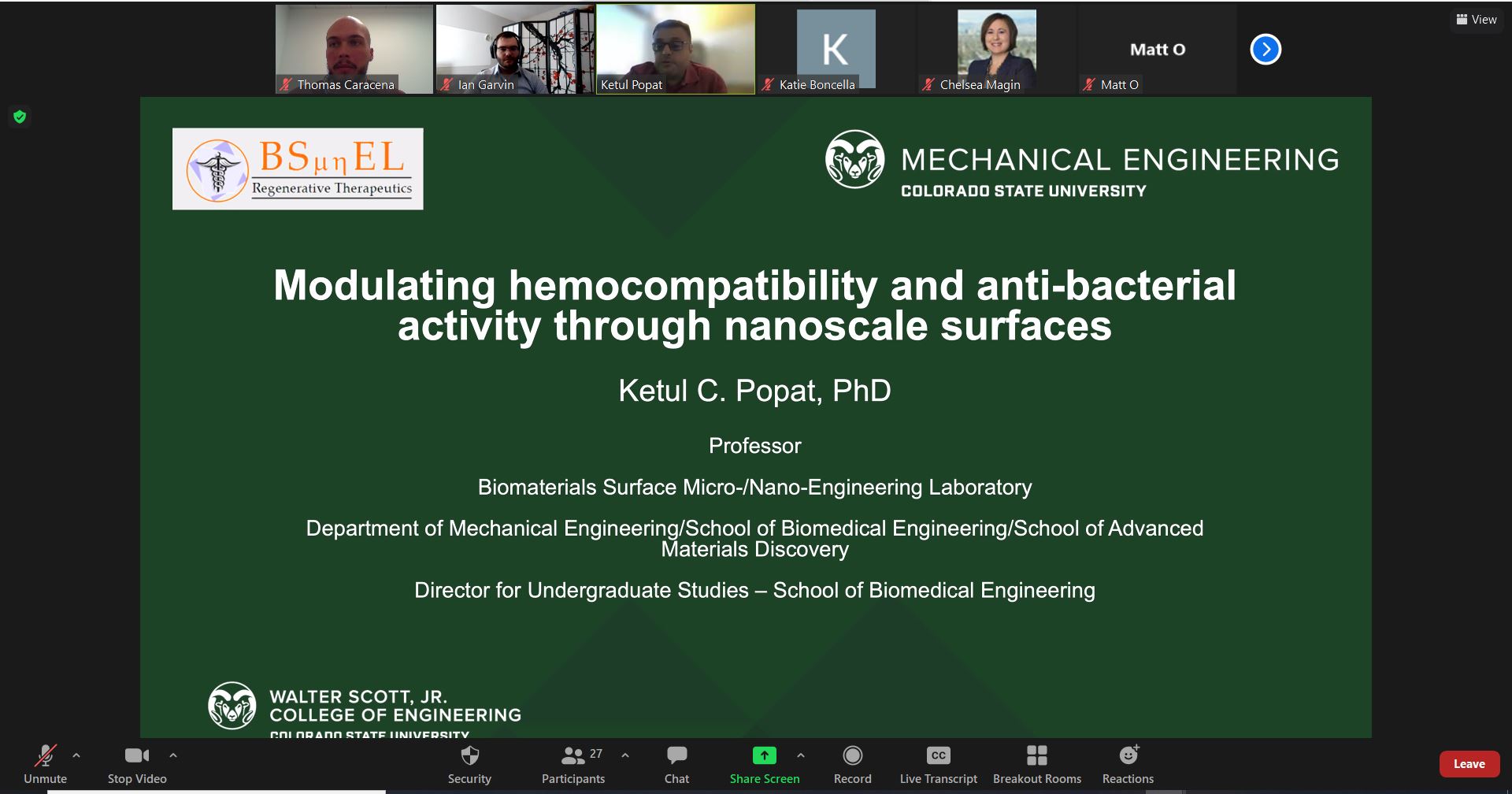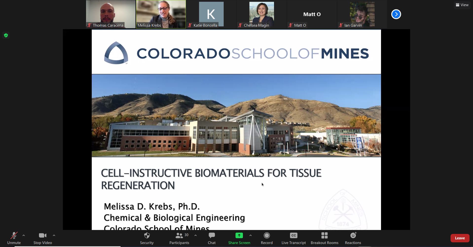 The University of Colorado Denver | Anschutz Medical Campus student chapter of the Society for Biomaterials (CU SFB) hosted the inaugural Rocky Mountain Biomaterials Day on October 15. The goal of this conference was to connect students, faculty, research staff, and more, from both academia and industry, who had an interest in learning more about current research in the field of biomaterials. Nearly 40 people from 10 different institutions throughout the Rocky Mountain region attended the virtual conference, which featured keynote talks from Dr. Melissa Krebs from Colorado School of Mines, and Dr. Ketul Popat from Colorado State University.