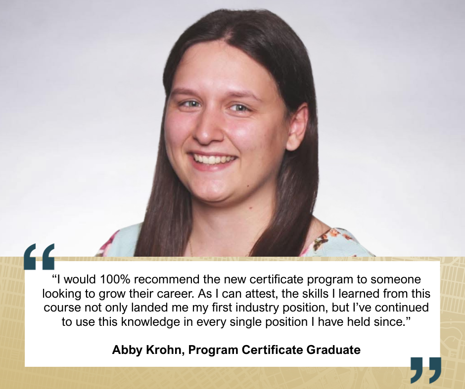 “I would 100% recommend the new certificate program that has come from Dr. Magin’s course to someone looking to grow their career,” she said. “As I can attest, the skills I learned from this course not only landed me my first industry position, but I’ve continued to use this knowledge in every single position I have held since.”