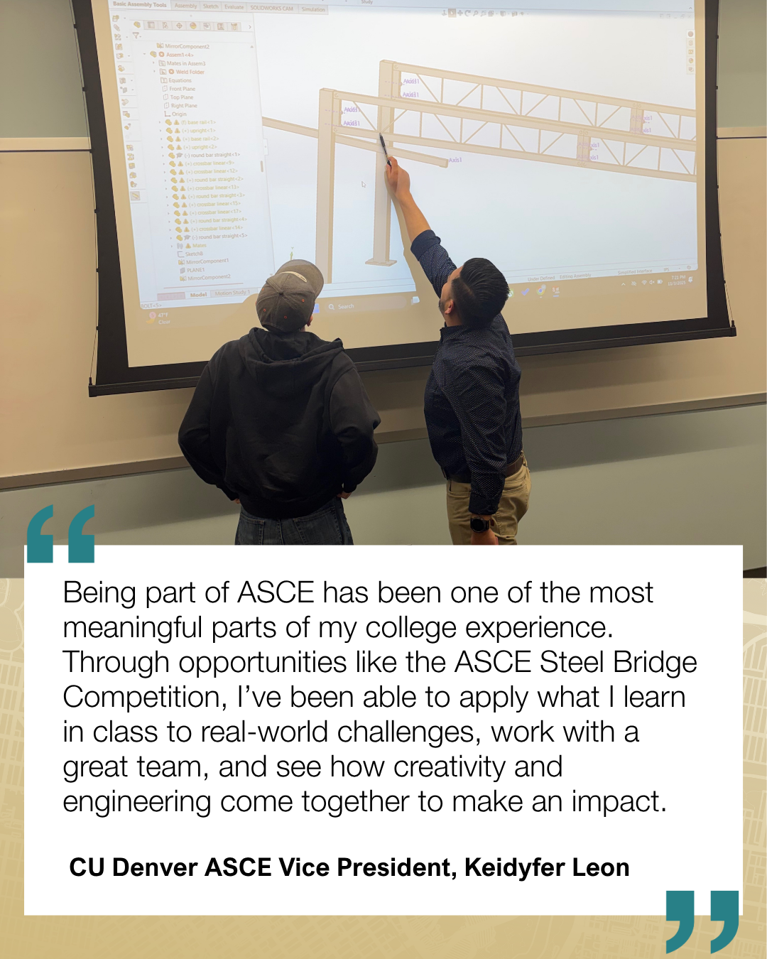 “Being part of ASCE has been one of the most meaningful parts of my college experience. Through opportunities like the ASCE Steel Bridge Competition, I’ve been able to apply what I learn in class to real-world challenges, work with a great team, and see how creativity and engineering come together to make an impact.” – CU Denver ASCE Vice President, Keidyfer Leon